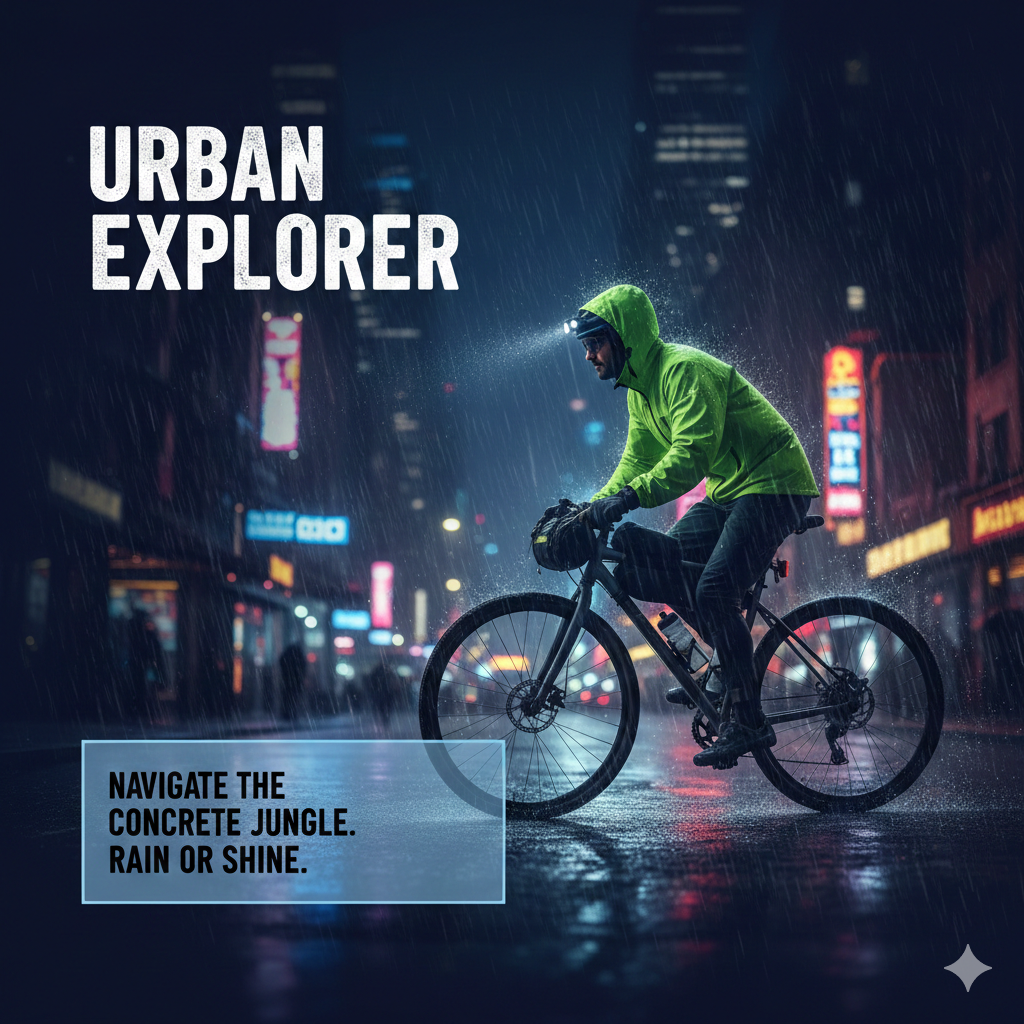 Image prompt idea: “16:9 poster, deep blue background, headline ‘URBAN EXPLORER’ in bold white sans upper-left, subhead bottom-left on a translucent card, subject is a cyclist in neon city rain, crisp legible text.”