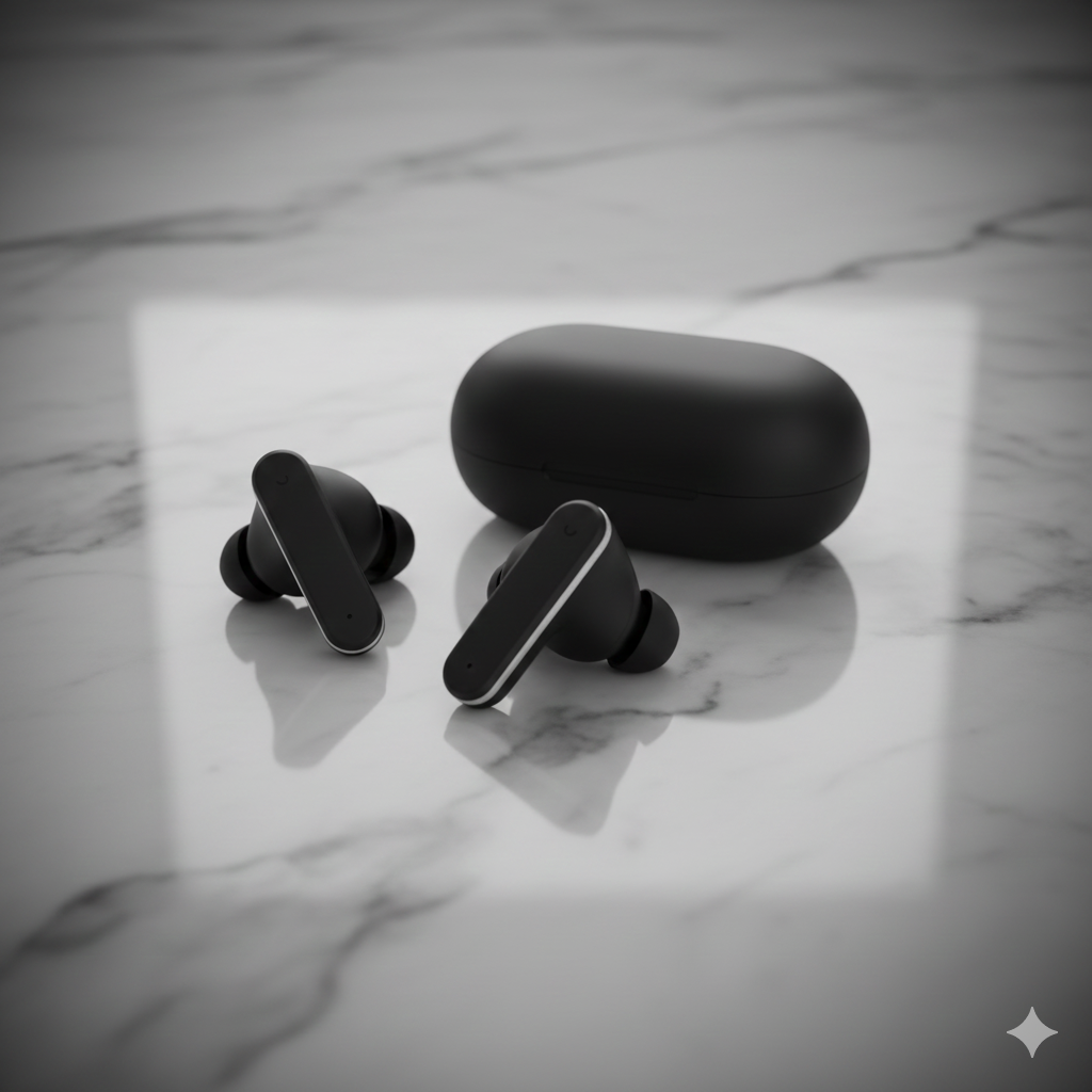 Image prompt idea: “Studio packshot, matte black wireless earbuds on marble, 3/4 top-down, dual rim lights, shallow DOF, subtle vignette, neutral color grade, 2K.”