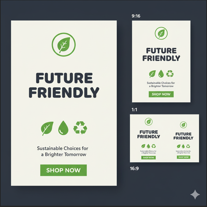 Image prompt idea: “Eco brand hero, palette #22c55e and #0f172a on off-white, rounded sans headline, flat icons no shadows, logo top-left with clearspace, CTA solid green; also request 9:16 story and 16:9 banner versions.”