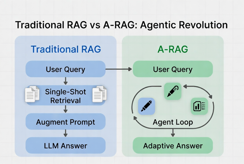 Hình 1: So sánh quy trình RAG truyền thống (cứng nhắc) và A-RAG (agentic, linh hoạt).
