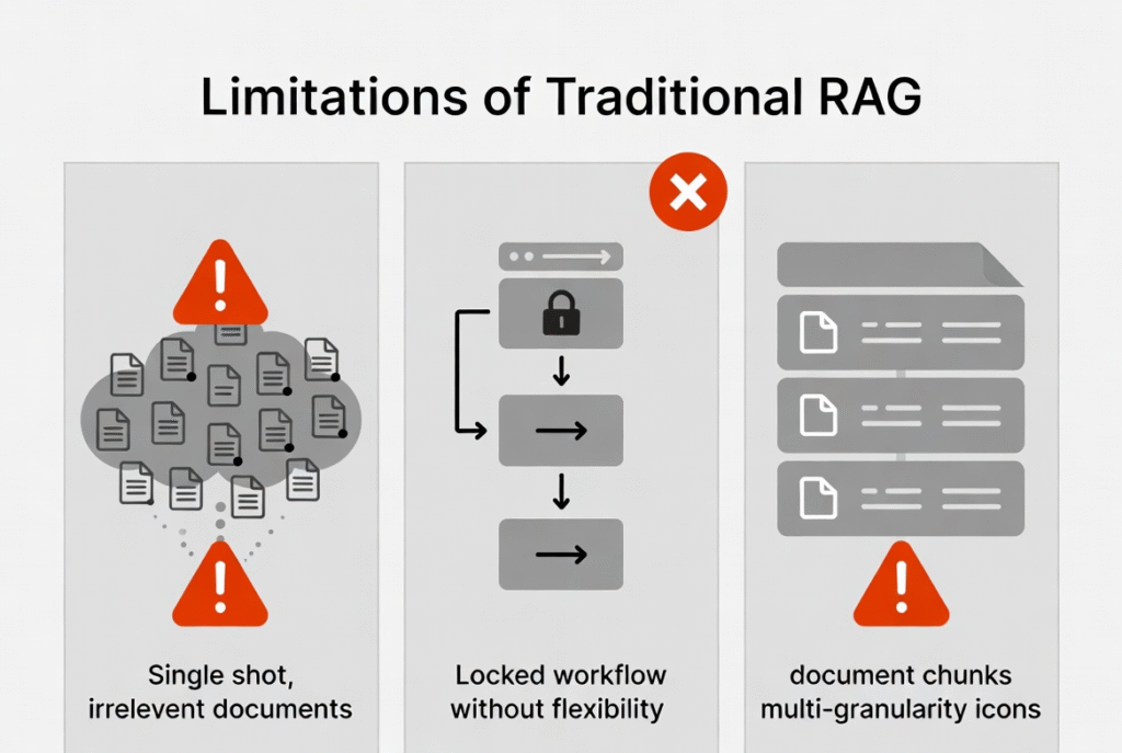 Hình 2: Minh họa hạn chế của RAG truyền thống (noise, workflow cứng nhắc, thiếu granularity).