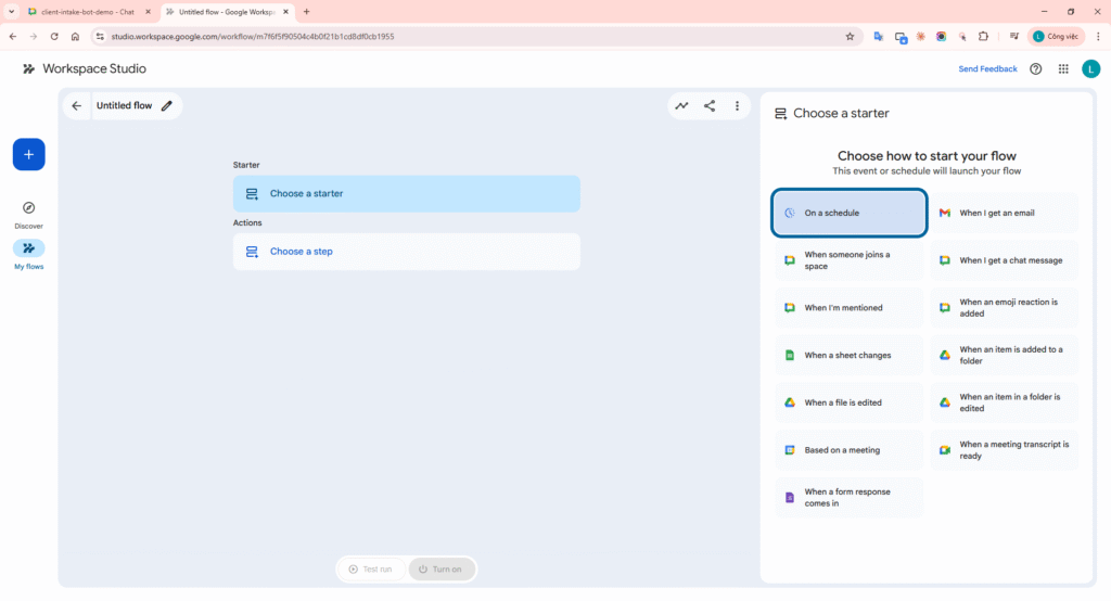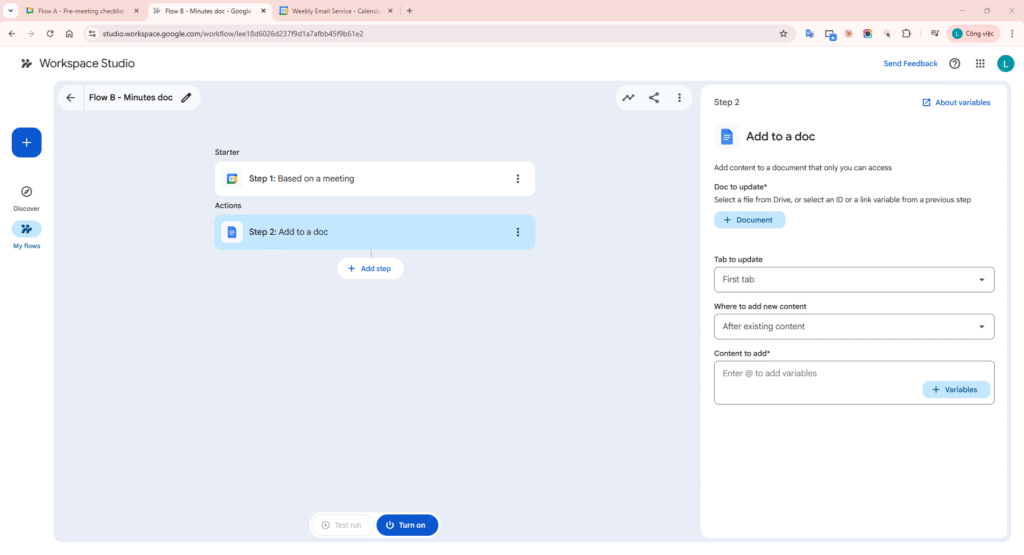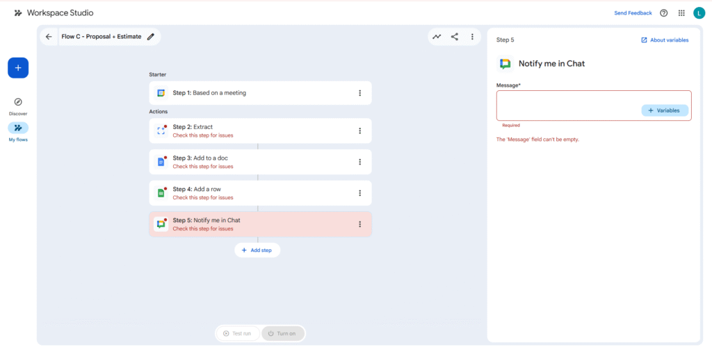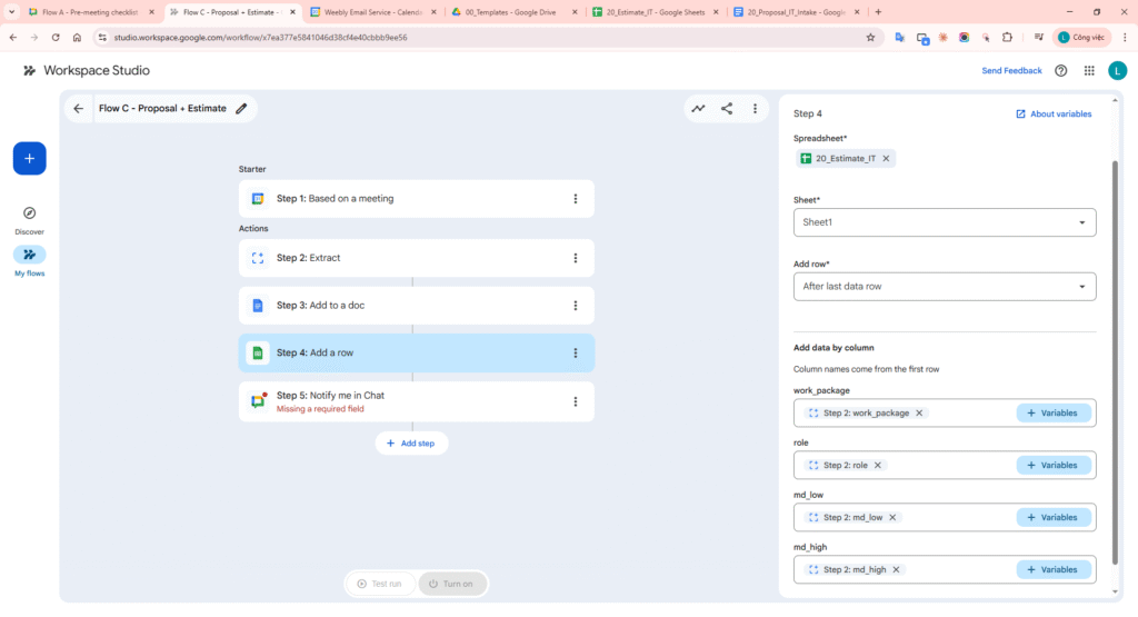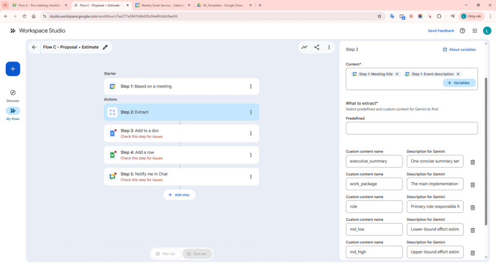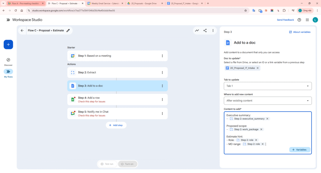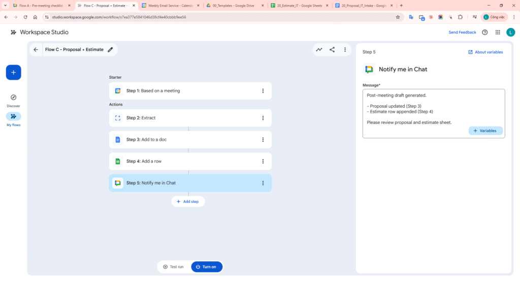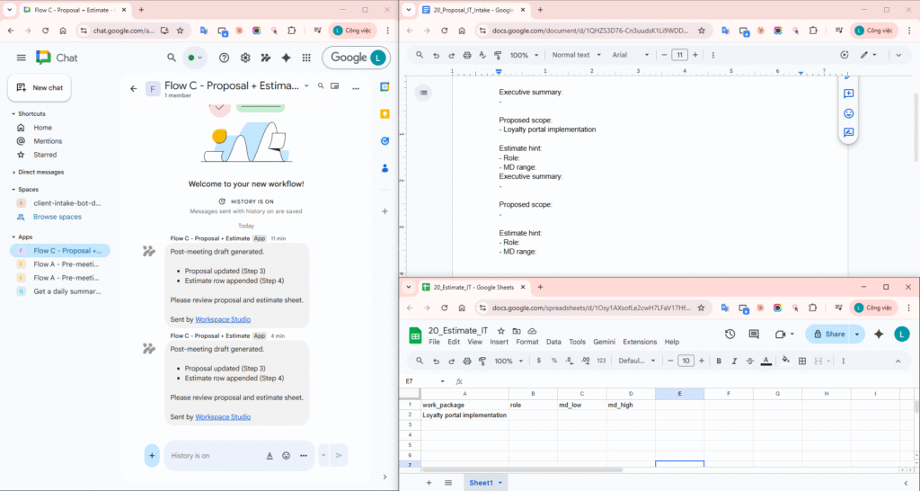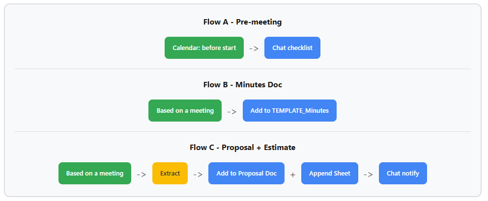 - Flow C – Post-meeting: trigger from meeting -> Extract key points -> Add to a doc (proposal) -> Add a row (estimate sheet) -> Notify me in Chat.