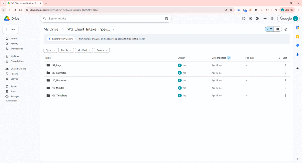 Step 1 instruction: Open Google Drive pipeline root folder and show subfolders 00_Templates, 10_Minutes, 20_Proposals, 30_Estimates, 99_Logs.