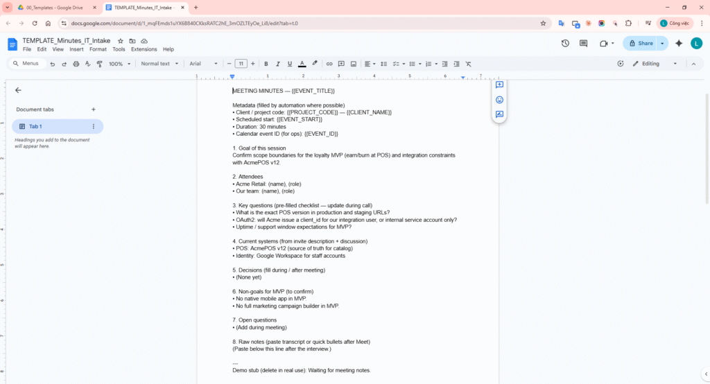 Step 2 instruction: Open minutes template Doc TEMPLATE_Minutes_IT_Intake and show metadata and core sections (Goal, Key questions, Raw notes).