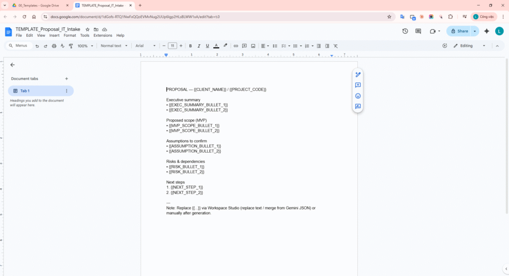 - Open the proposal Doc and confirm content was inserted from Step 2 outputs.