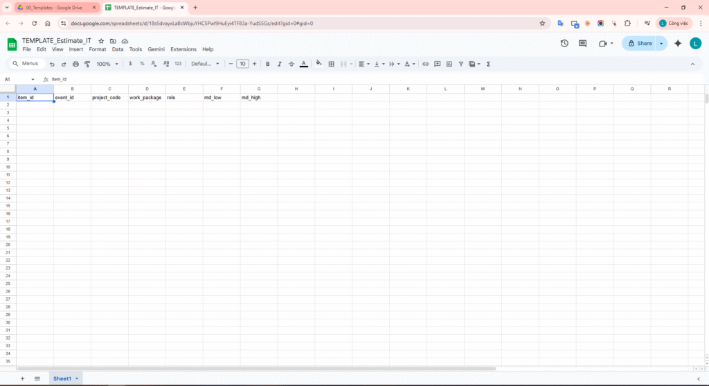 Step 4 instruction: Open estimate Sheet template and verify headers item_id,event_id,project_code,work_package,role,md_low,md_high,source.