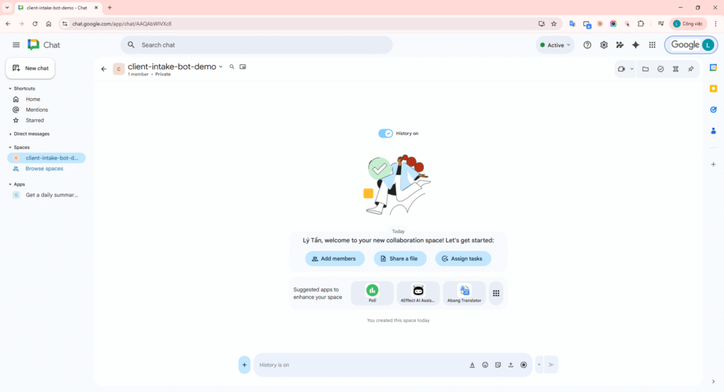 Step 5 instruction: Open Google Chat and enter the target space (example: client-intake-bot-demo).