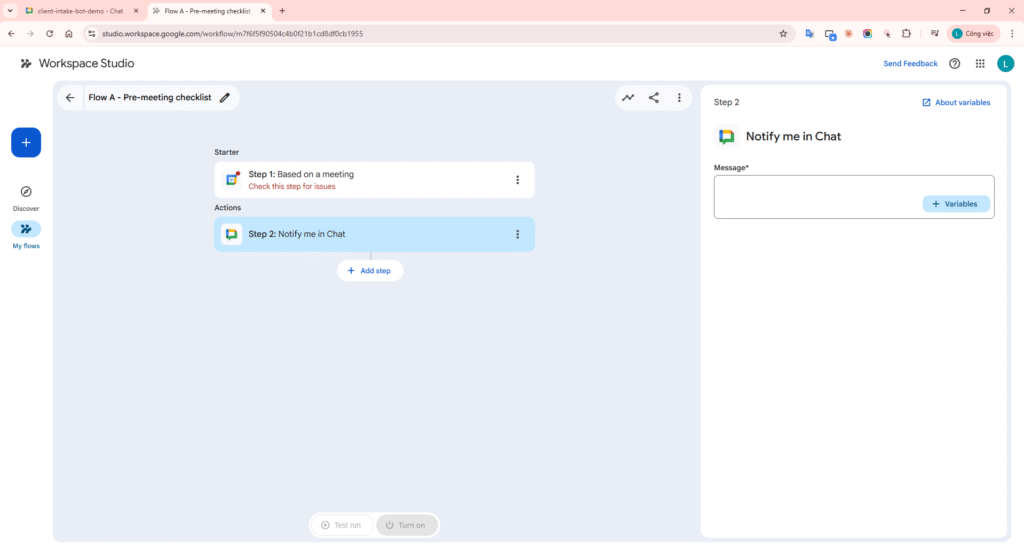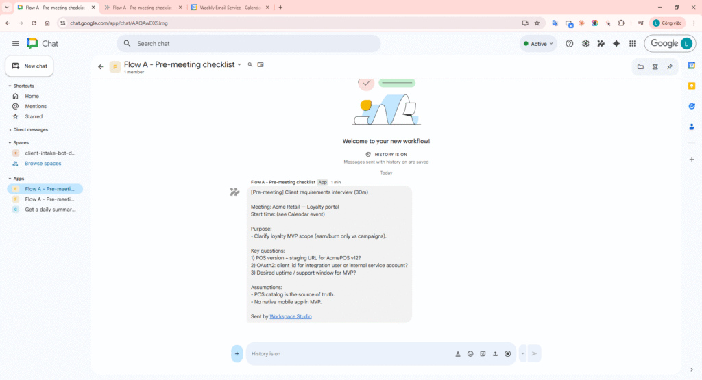 Flow A – Pre-meeting checklist (Google Chat)