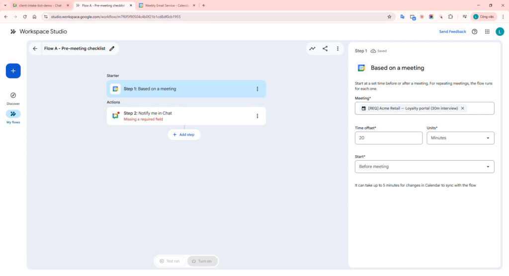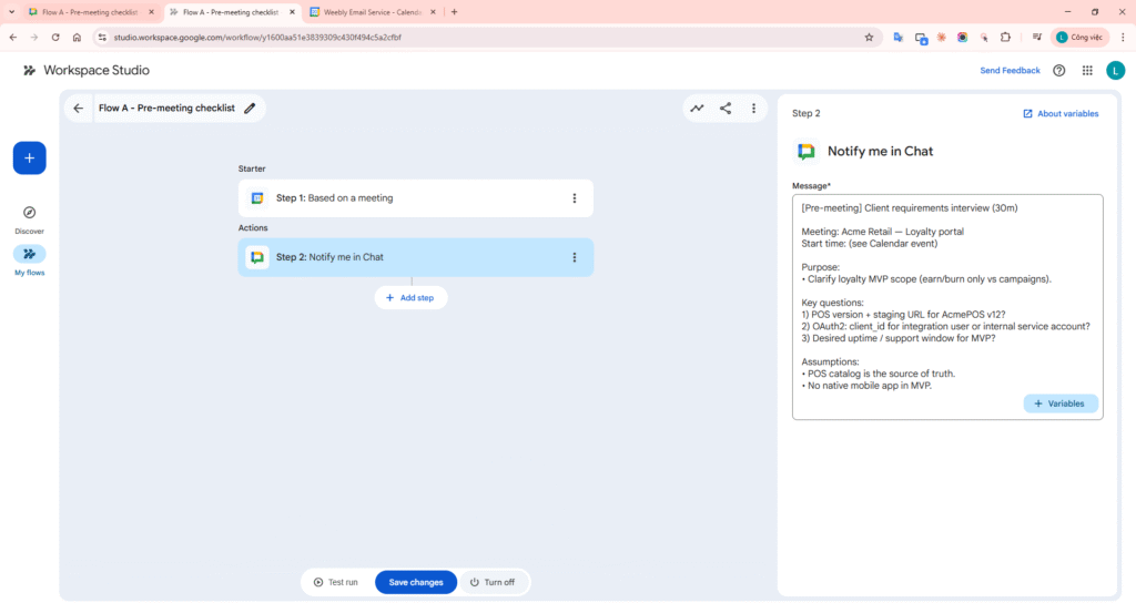 - Flow A – Pre-meeting: time-based trigger before event start -> send checklist to Google Chat.