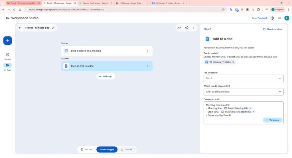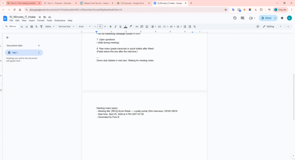 - Flow B – Minutes update: trigger from meeting -> Add to a doc appends “Meeting notes (auto)” to 10_Minutes_IT_Intake (as shown in Step 11-13).