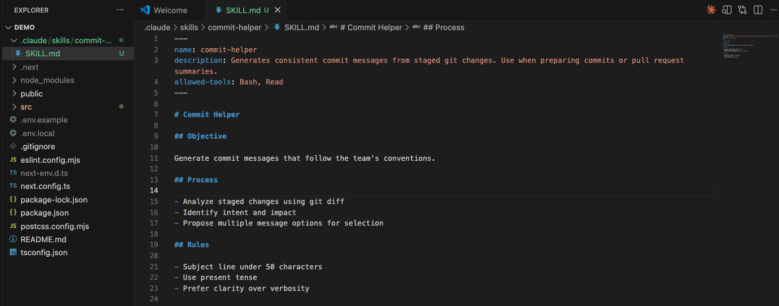 File SKILL.md cần bắt đầu bằng YAML frontmatter, trong đó xác định tên Skill, mô tả và các công cụ được phép sử dụng.--- name: commit-helper description: Generates consistent commit messages from staged git changes. Use when preparing commits or pull request summaries. allowed-tools: Bash, Read --- # Commit Helper ## Objective Generate commit messages that follow the team's conventions. ## Process - Analyze staged changes using git diff - Identify intent and impact - Propose multiple message options for selection ## Rules - Subject line under 50 characters - Use present tense - Prefer clarity over verbosity
