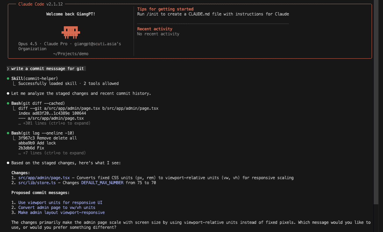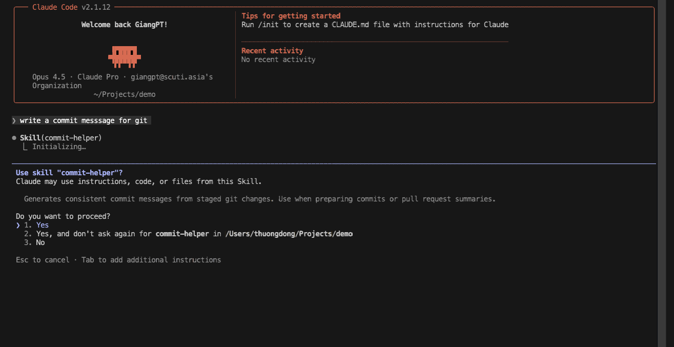Claude Code hỏi dùng skill “commit-helper” không? Enter để chọn option 1 và hiển thị ra những đề xuất commit
