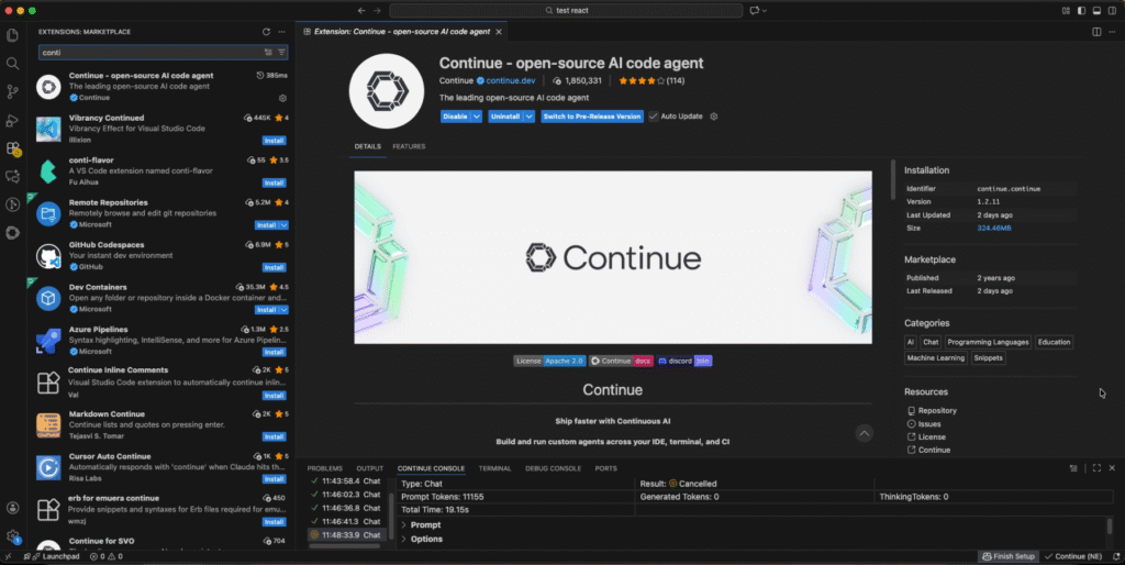 Continue.dev is an open-source AI coding assistant that runs directly inside VS Code.