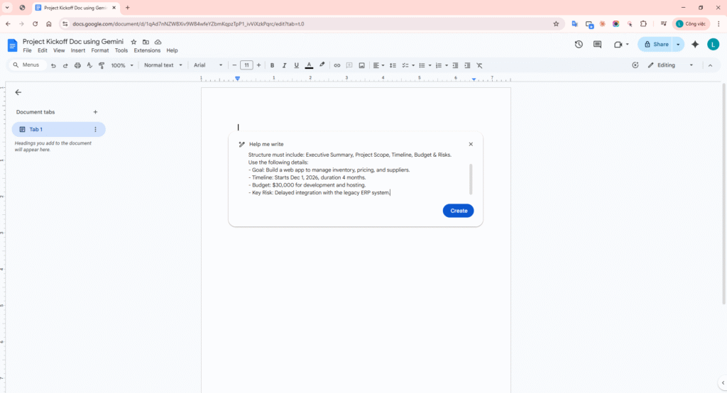 Applying Gemini (Help me write) in Google Docs completely transforms how we approach traditional office documentation. Compared to using external AI chatbots (like web-based ChatGPT) and manually copy-pasting back and forth, the Workspace Native solution provides a significantly smoother and more data-secure experience for enterprise users.
