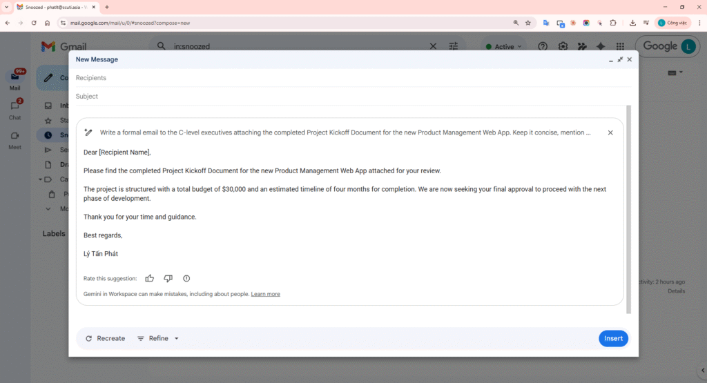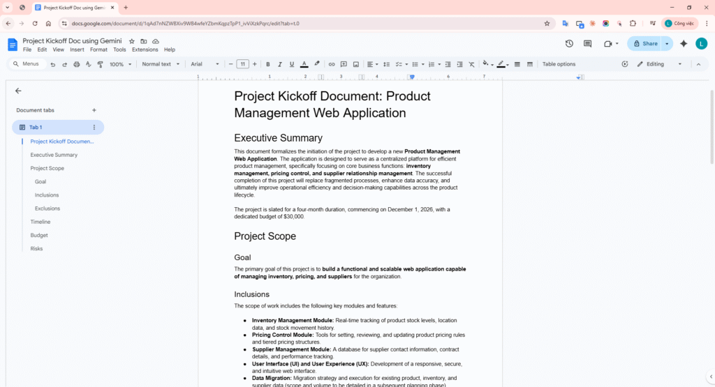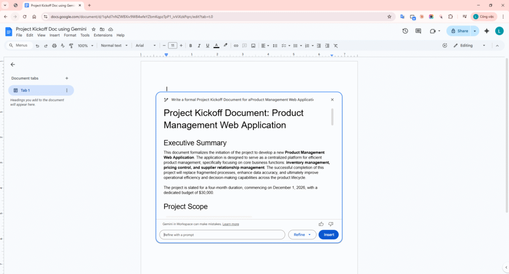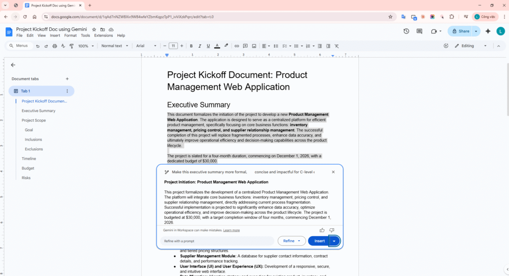 Gemini in Google Docs did not hallucinate any out-of-scope information such as “The project utilizes React/NodeJS” or “The budget includes $5,000 for Marketing”. It retained 100% of the Core Facts from the initial rough draft and merely articulated them more professionally.