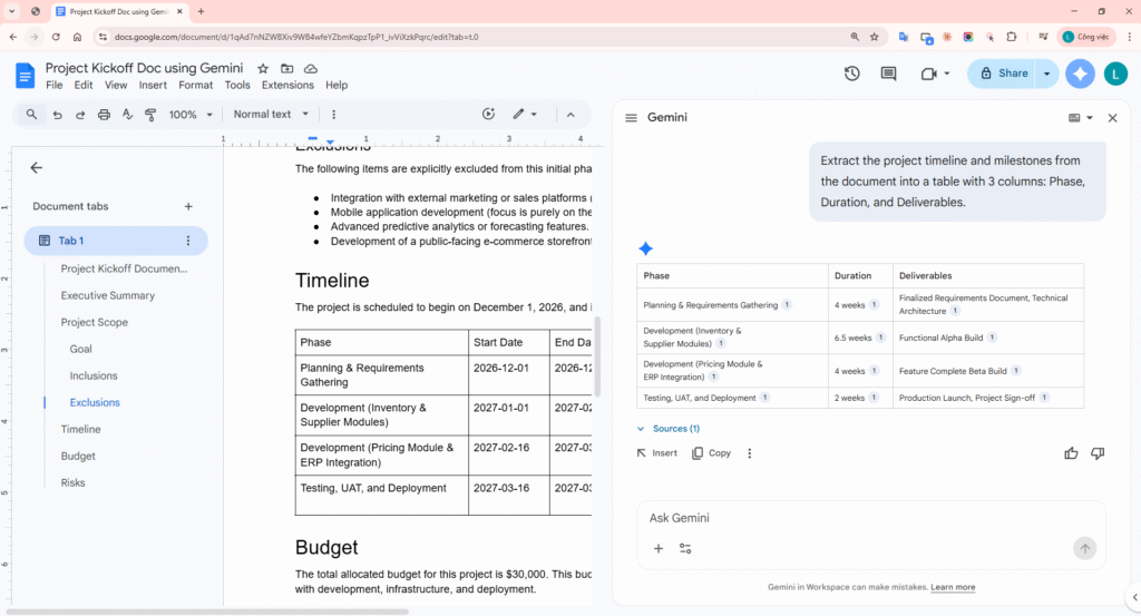 Instead of listing the Timeline as running text, you can ask the Gemini Side Panel to locally extract the text regarding milestones into a clearly formatted table.