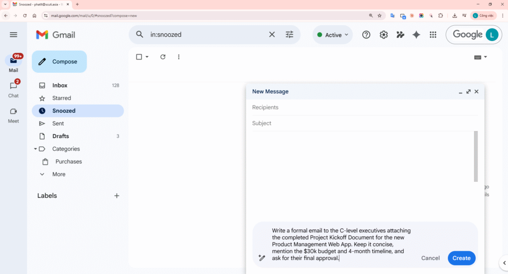 PROMPT 4 – GMAIL DRAFT: Write a formal email to the C-level executives attaching the completed Project Kickoff Document for the new Product Management Web App. Keep it concise, mention the $30k budget and 4-month timeline, and ask for their final approval.