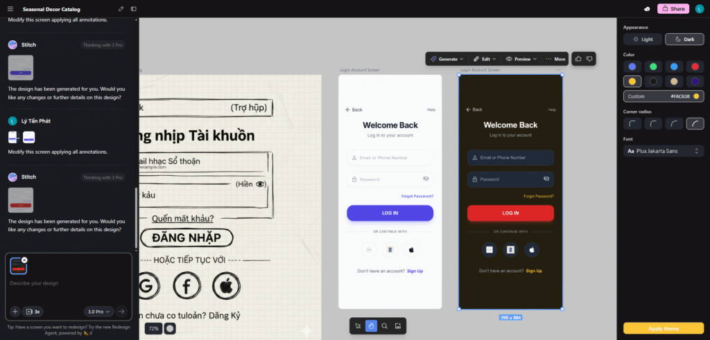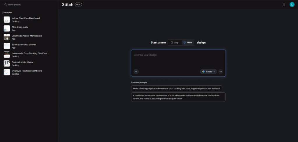 Type a prompt in “Describe your design” to generate a UI for App or Web. Stitch also provides sample prompts and lets you choose a model (e.g., “3.0 Pro”).