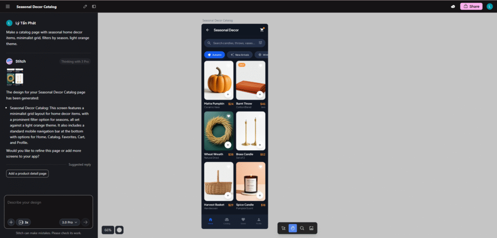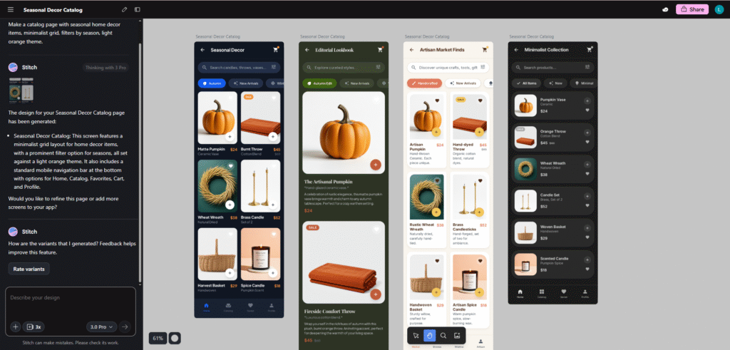 • “Make a catalog page with seasonal home decor items, minimalist grid, filters by season. Light orange theme.”