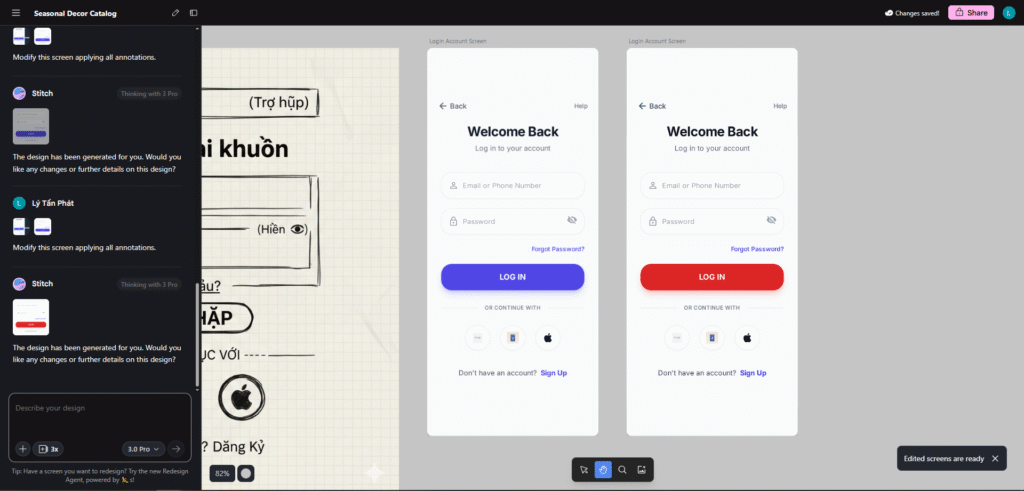 Click the arrow (→). Stitch will generate a design based on the image + instruction.