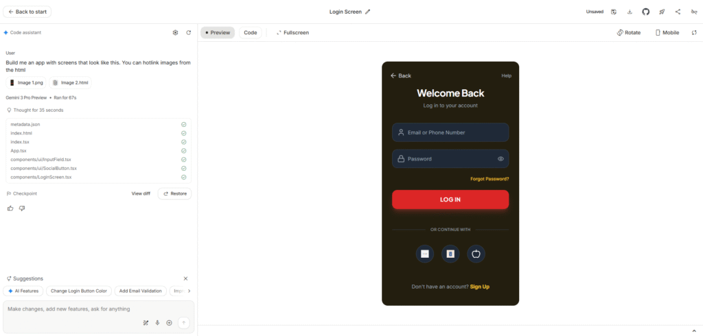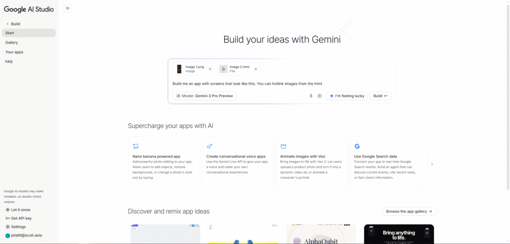 AI Studio will open with your image and a prefilled prompt like: Build me an app with screens that look like this. You can hotlink images from the html Then click Build to generate code and screens.