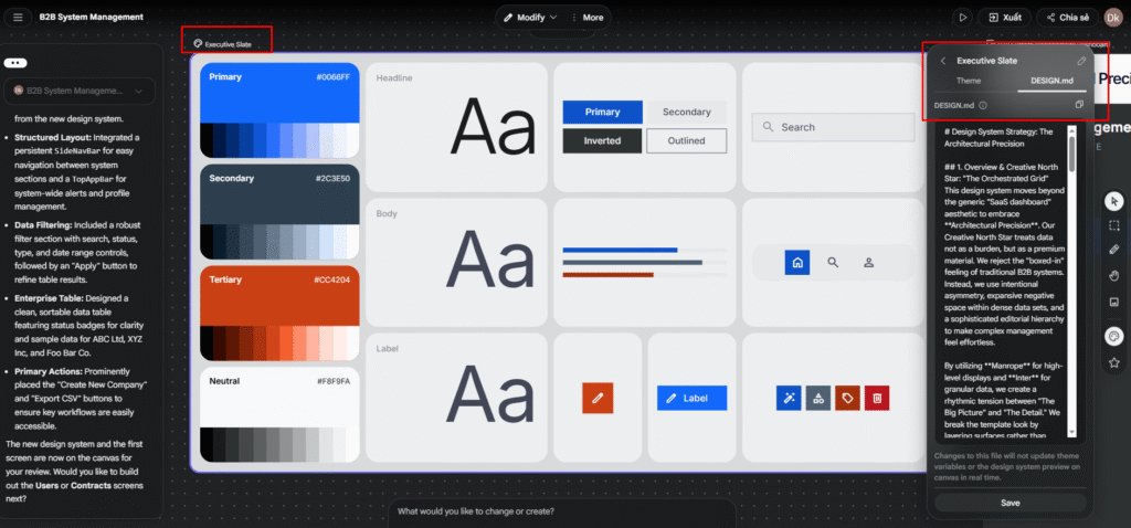Second is DESIGN.md, displayed in the right-hand panel. Clicking on the visual panel opens a right-hand panel showing tabs for “Theme” and “DESIGN.md”. Opening the “DESIGN.md” tab displays the design rules, summarized in Markdown format.