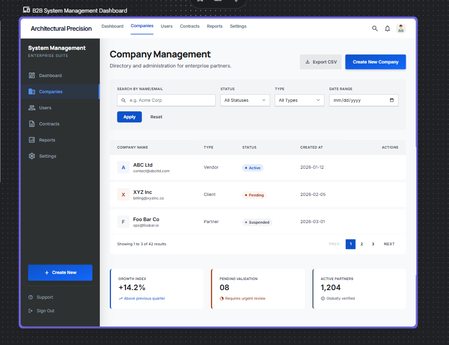 This screen is designed for administrators to manage companies, users, and system status in a B2B platform.