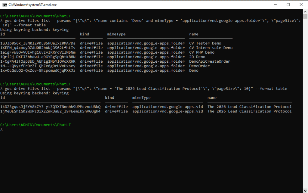 gws drive files list --params "{\"q\": \"name = 'The 2026 Lead Classification Protocol'\", \"pageSize\": 10}" --format table