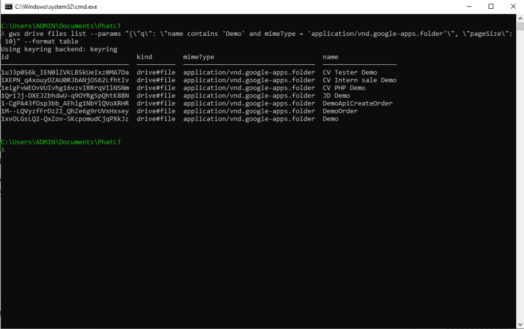 gws drive files list --params "{\"q\": \"name contains 'Demo' and mimeType = 'application/vnd.google-apps.folder'\", \"pageSize\": 10}" --format table