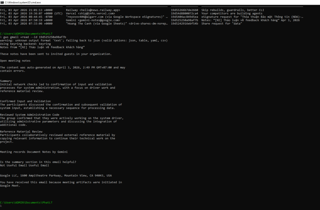 The output returns the complete text content of the email. gws automatically handles decoding the base64-encoded body that Gmail’s API returns, rendering it as plain readable text directly in the terminal.