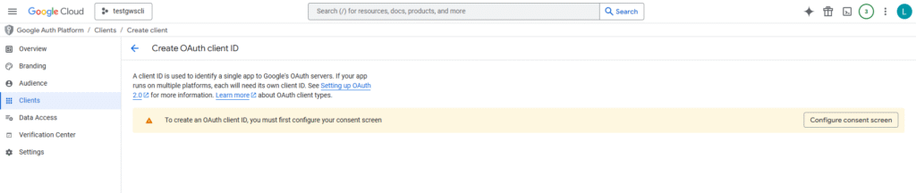You Must Configure the Consent Screen First: If this is a new Project, Google will immediately block you with the warning: “To create an OAuth client ID, you must first configure your consent screen” and show a Configure consent screen button. This step is mandatory — you cannot skip it.
