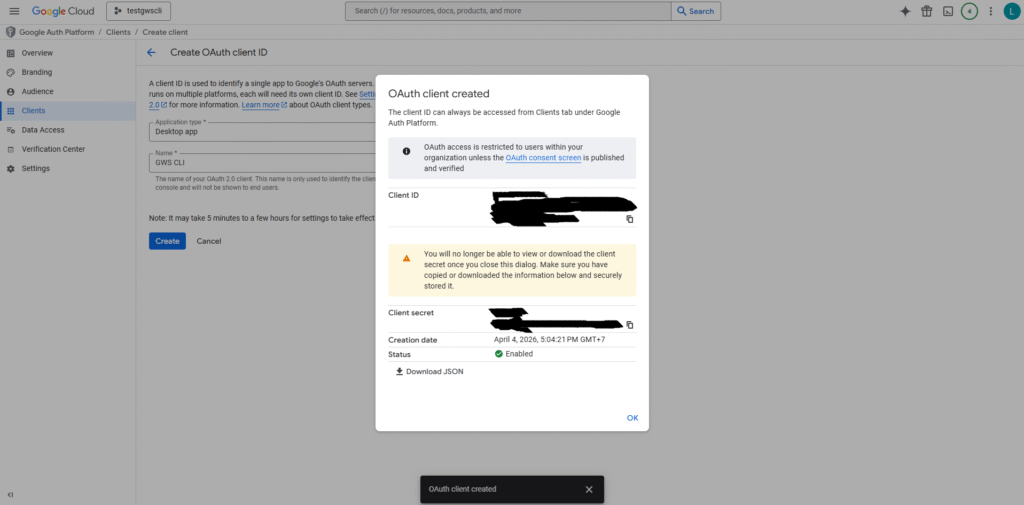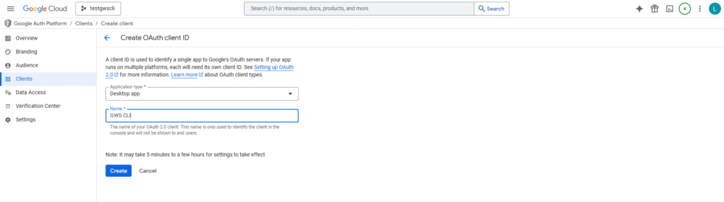 This is the step many users skip and then run into errors. gws requires an “OAuth App” inside your Google Cloud project to authenticate.