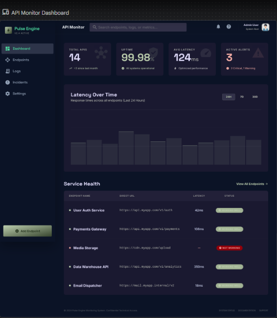 “Create a modern, dark mode web interface for monitoring API endpoints. The layout should include a left sidebar with navigation, a top header with an ‘Add Endpoint’ button. The main area should have four summary tabs (Total APIs, Uptime, Average Latency, Alerts), a location for a line graph showing latency, and a data table below listing the API name, URL, and status badge (Working Well in green, Not Working in red). Use a modern, technology-focused font and Tailwind CSS style.”