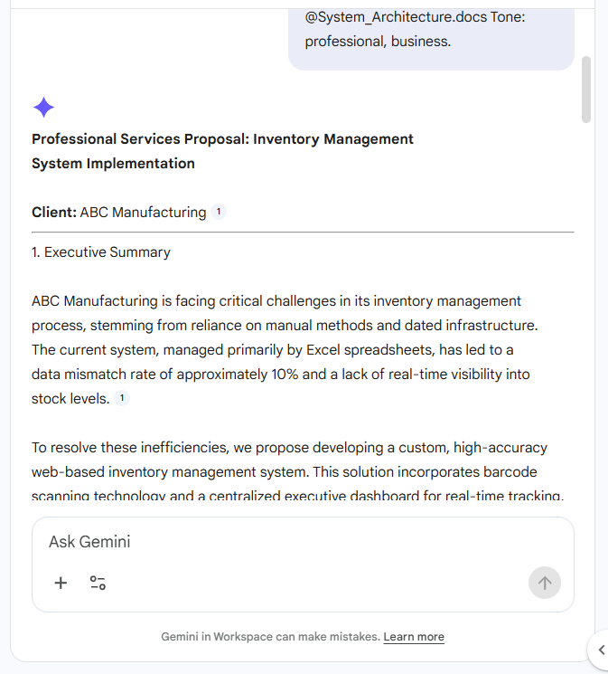Goal: Turn rough bullets + Drive docs into a 2-page professional proposal draft using Gemini in Google Docs.