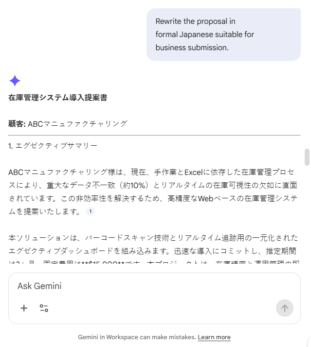 The Prompt: Rewrite the proposal in formal Japanese suitable for business submission.