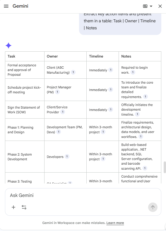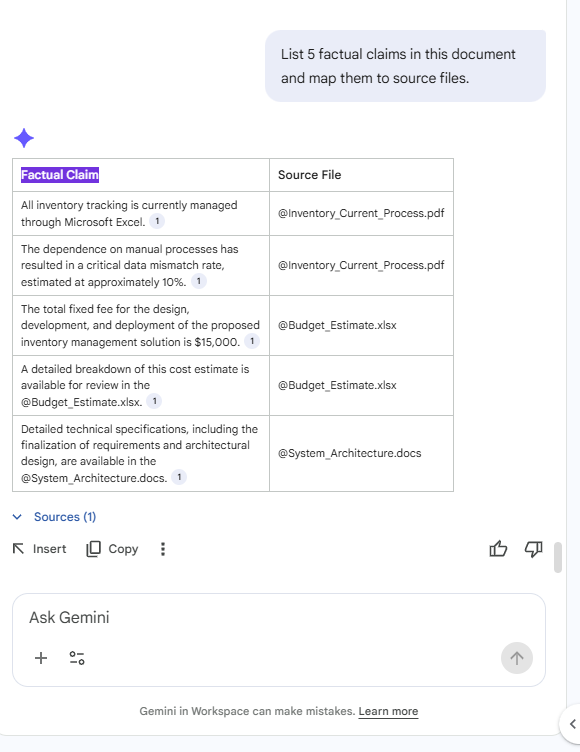 - Potential inaccuracies: Gemini may generate assumptions or estimated figures when real data is not provided, requiring manual validation.