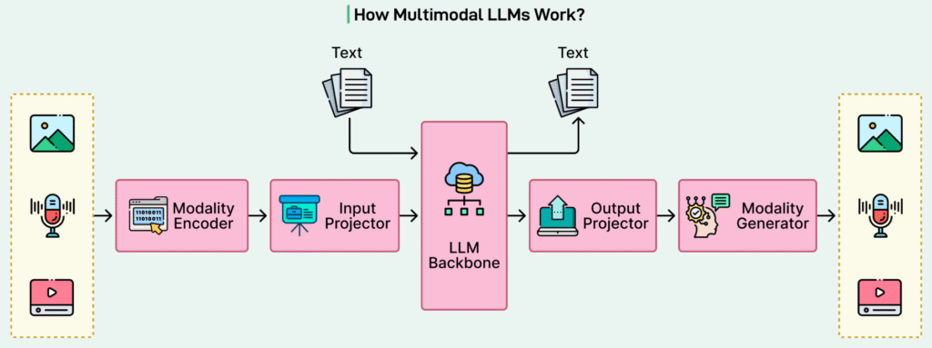 Multimodal Large Language Models (LLMs) address this limitation by integrating multiple data modalities into a single unified reasoning system. Instead of building independent pipelines for each input type, modern architectures allow different modalities to be processed together, enabling richer understanding and more complex cross-modal reasoning.