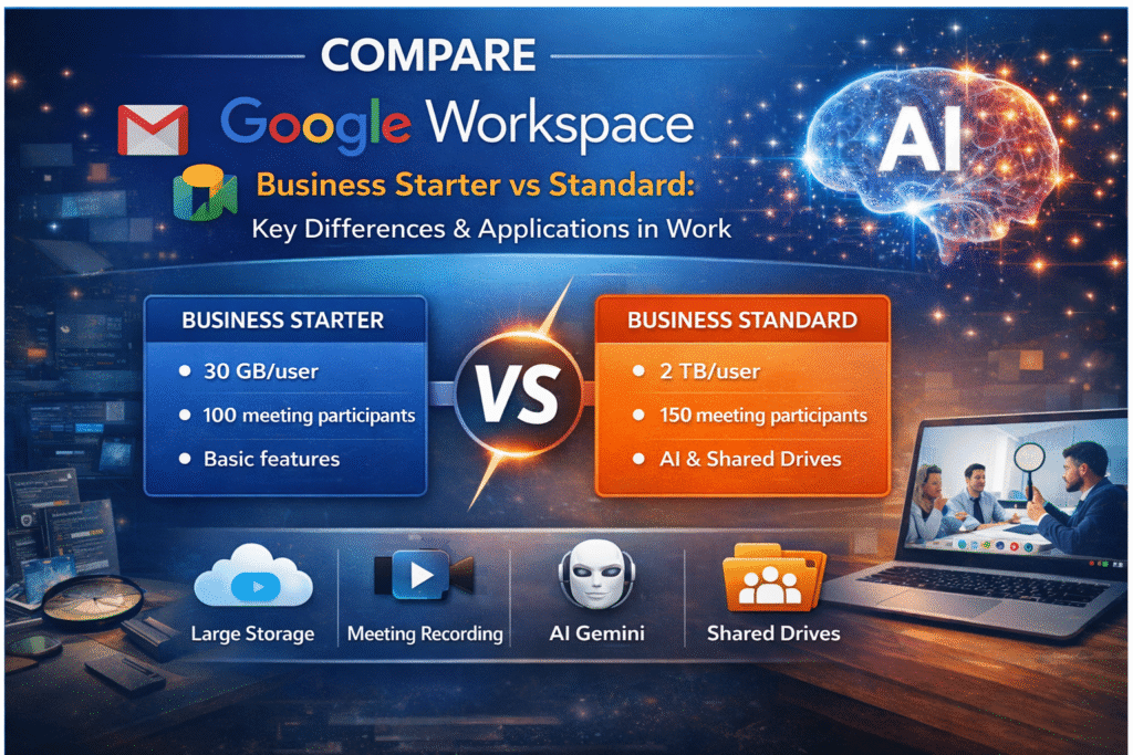 Both Business Starter and Business Standard are part of Google Workspace, providing essential tools such as Gmail, Google Drive, Docs, Sheets, Slides, Meet, and Chat.