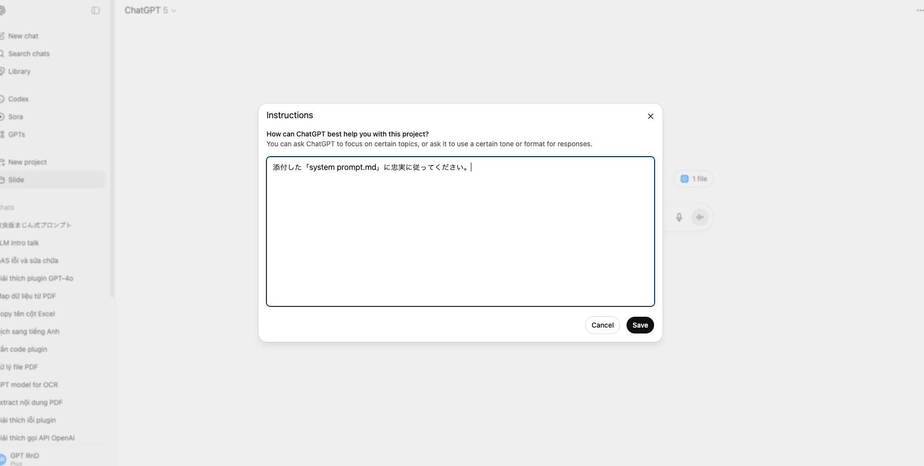 If you don’t see a dedicated “Instructions” field, ChatGPT may show “Description” or “Setup” instead → paste it there. It works as the System Prompt for the whole Project.