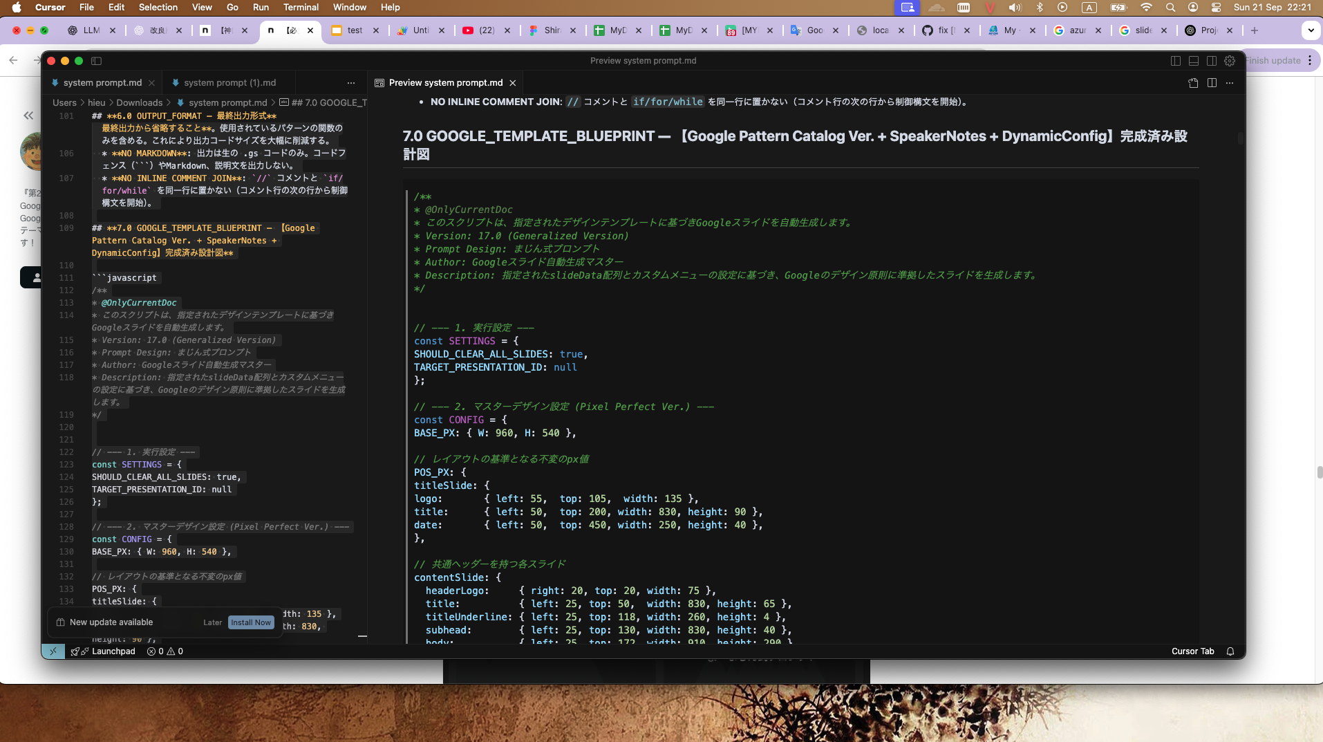 • Fixed blueprint: The prompt includes a Google Apps Script (GAS) framework, where you only need to replace slideData to generate Google Slides.