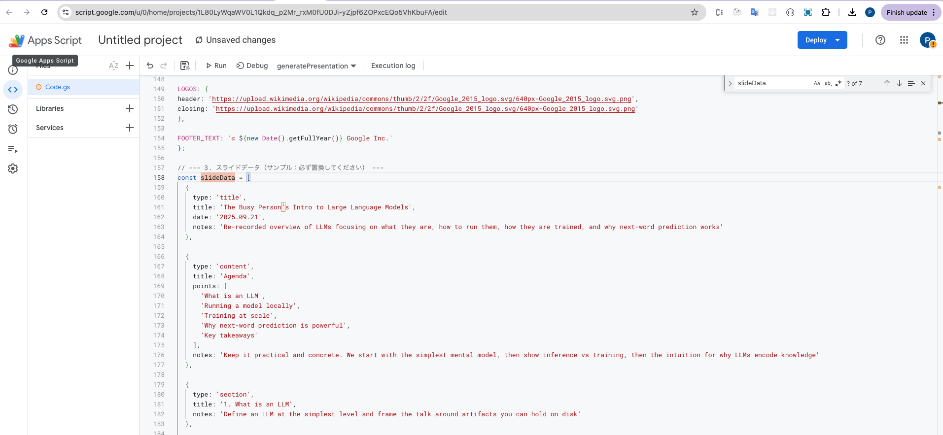 👉 The important point: The prompt does not directly create slides, but outputs JSON-like data that the GAS script uses to build the slides.