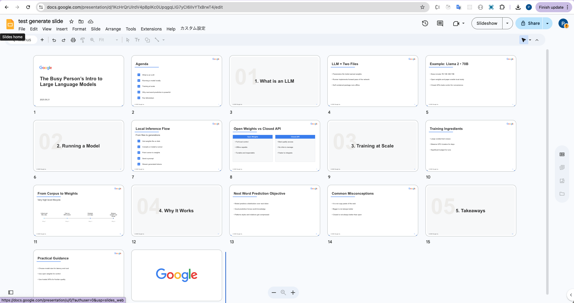 • You just need to customize the input → and you can generate Google Slides for any topic (training, pitching, learning…).