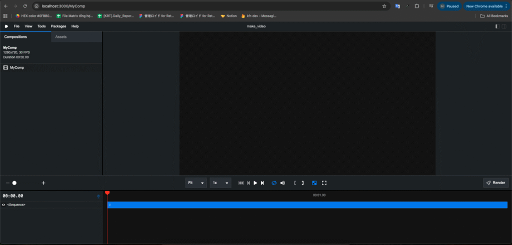Sau đó, bạn chạy server phát triển để mở giao diện xem trước video trên trình duyệt. Lúc này, bạn sẽ thấy một màn hình trống vì project chưa có nội dung nào.