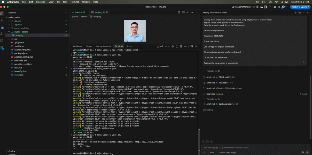 Bài viết này sẽ giải thích Anti Gravity là gì, Remotion là gì, vì sao sự kết hợp của hai công cụ này lại mạnh mẽ, và quan trọng nhất là hướng dẫn từng bước chi tiết để bạn có thể tự tạo ra một video YouTube hoàn chỉnh bằng prompt.
