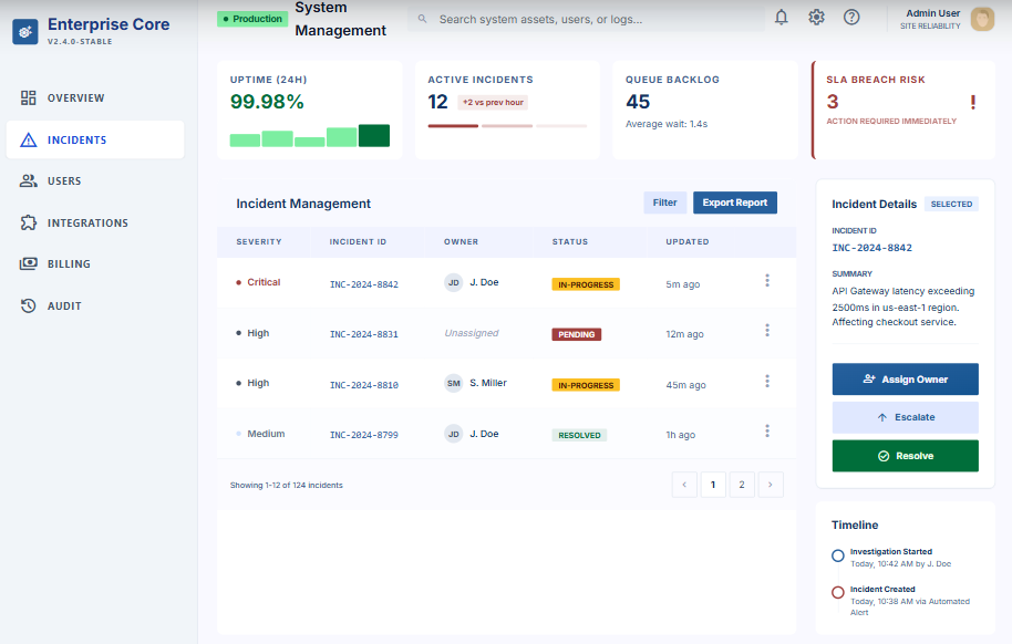 – KPI row: Uptime, Active Incidents, Queue Backlog, SLA Breach Risk