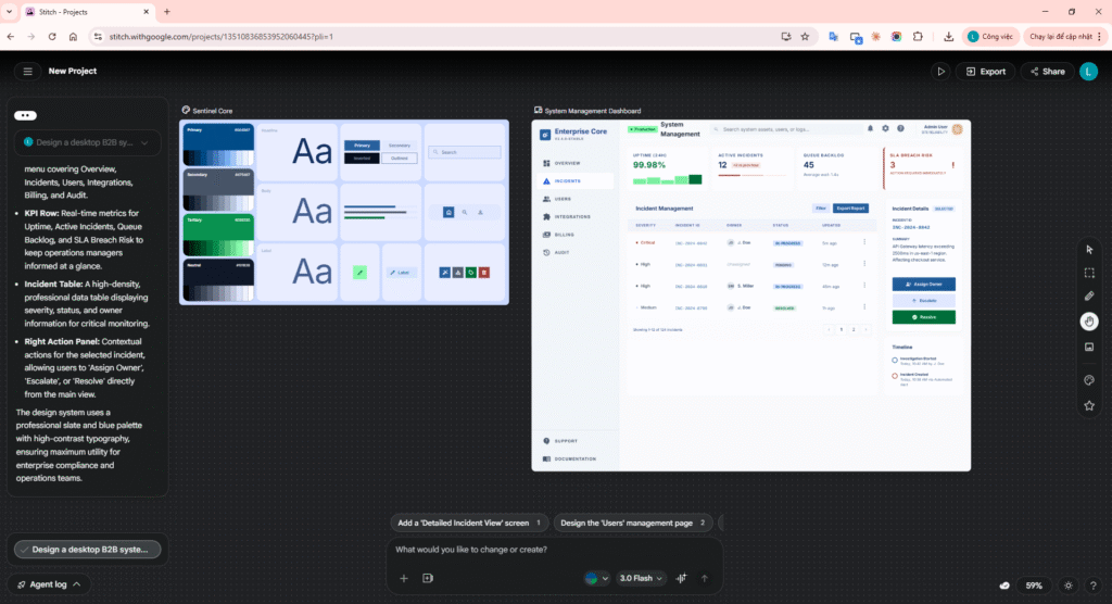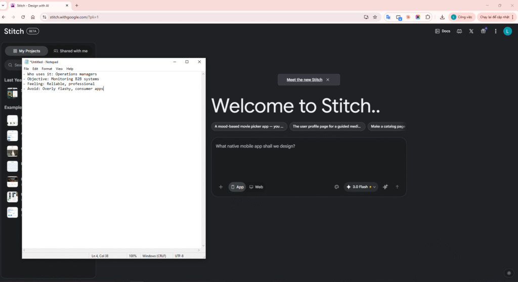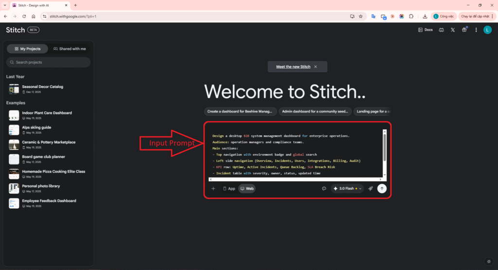 Action step 3: Paste the detailed Prompt into Stitch’s Chat box to let AI start working.