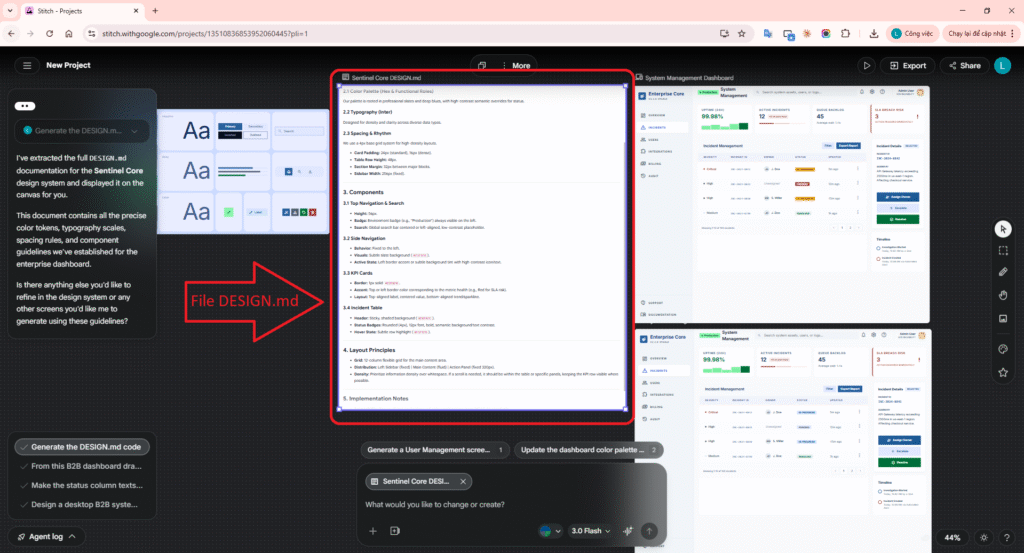 Step 4: Extract Design System & DESIGN.md: Instruct Stitch to standardize the draft into a complete Design System (Colors, Typography, Layout spacing) and crucially export these rules to a text file named DESIGN.md.