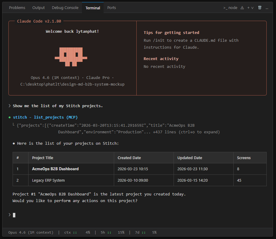 Action step 12: Open VS Code Terminal, use Claude Code MCP to connect to Stitch and list the projects.