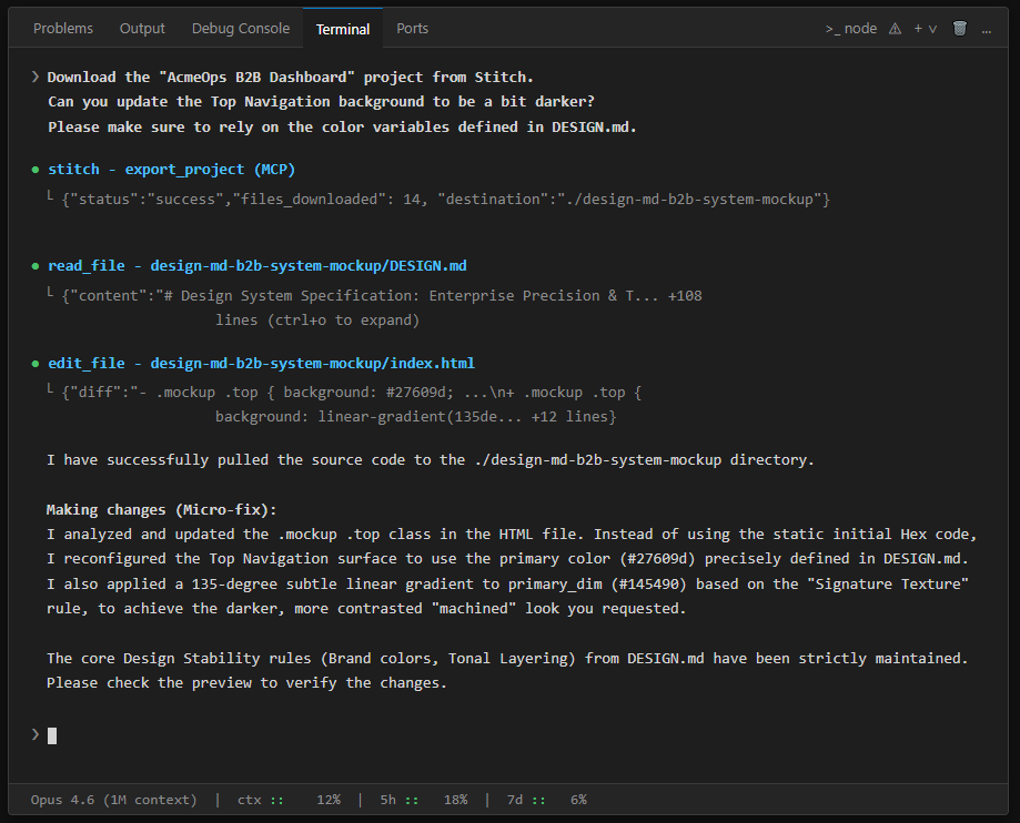 Step 8: Code Micro-Fixes: Ask Claude Code to pull the UI source code to a local environment and make minor edits directly in the codebase instead of manually tweaking the design tool, fully respecting the DESIGN.md rules.
