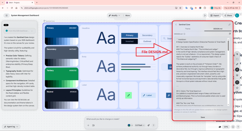 Step 4: Extract Design System & DESIGN.md: Instruct Stitch to standardize the draft into a complete Design System (Colors, Typography, Layout spacing) and crucially export these rules to a text file named DESIGN.md.